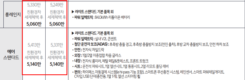 - 에어(Air): 롱레인지의 기본형 트림으로, 실용성에 중점을 둔 사양 구성이 특징입니다. 12.3인치 디스플레이 콤보, LED 헤드램프, 스마트 크루즈컨트롤, 19인치 휠 등을 기본 적용하며, 가격 경쟁력이 높은 것이 강점입니다.