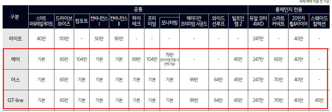 | 스마트 파워 테일게이트 | 미포함 | 기본적용 |