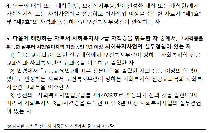 외국 대학이나 대학원에서 사회복지학 또는 사회사업학을 전공하고 학사학위 이상을 취득한 경우도 응시할 수 있습니다. 또한 제1호 및 제2호의 자격과 동등하다고 보건복지부장관이 인정하는 경우에도 응시 가능합니다.