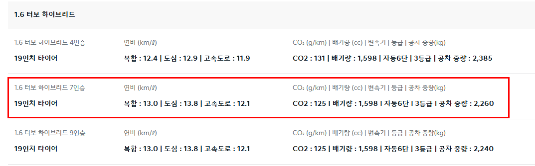 - 배기량: 3,470cc (3.5 가솔린) / 1,598cc + 전기 모터 54kW (터보 하이브리드)