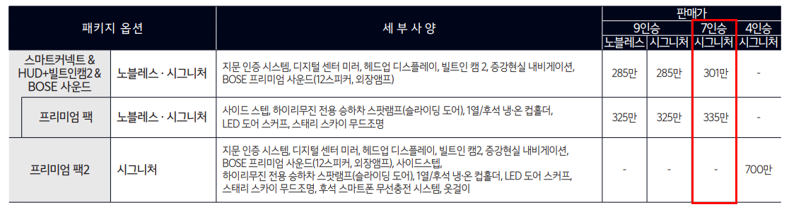 - 프리미엄 팩2(약 7,000,000원, 시그니처 전용): 지문 인증 시스템, 디지털 센터 미러, 헤드업 디스플레이, 빌트인 캠2, 증강현실 내비게이션, BOSE 프리미엄 사운드(12스피커, 외장앰프), 하이리무진 특화 사양 풀 옵션 포함.