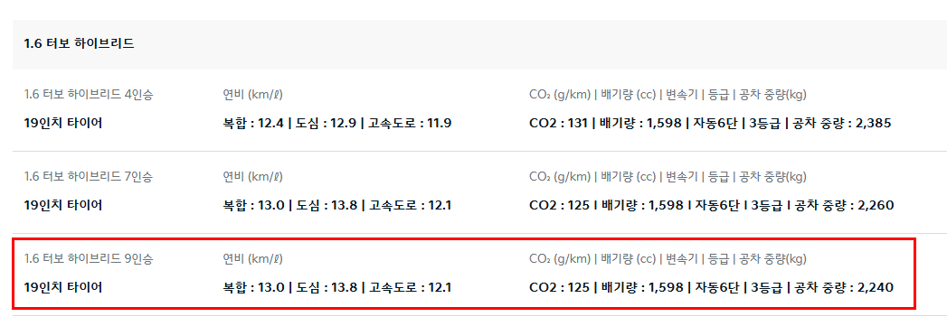 - 배기량: 1,598cc 가솔린 엔진과 54kW 전기 모터가 결합된 스마트스트림 터보 하이브리드 엔진 탑재.
