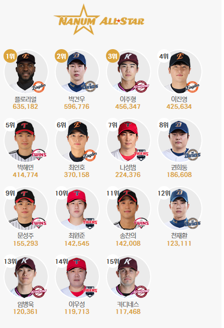 나눔 올스타에서는 한화 이글스가 선발투수(코디 폰세), 중간투수(박상원), 마무리투수(김서현), 외야수(에스테반 플로리얼), 지명타자(문현빈) 등 투수 전 부문과 외야, 지명타자까지 5개 포지션에서 1위를 기록 중입니다.